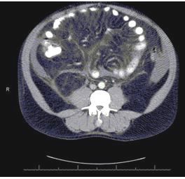 The patient was admitted for workup of abdominal pain and evaluation of ascites and bilateral pleural effusions noted on CT scan (Figure 1, left). There were no radiological findings of ischemic colitis, portal hypertension, hepatic vein thrombosis, or mesenteric ischemia. A complete blood cell count initially showed a hemoglobin level of 10.8 g/dL (normal range, 14-18 g/dL), a platelet count of 593,000/µL (normal range, 150,000-400,000/µL), and a normal white blood cell count of 91,000/µL, with eosinophilia (2300 cells/µL; normal <350 cells/µL); during the hospital course, the eosinophil count was as high as 4500/µL. Results of an iron panel were consistent with anemia of chronic disease. A comprehensive metabolic panel revealed BUN of 23 mg/dL (normal range, 8-23 mg/dL) and creatinine of 1.2 mg/dL (normal range, 0.6-1.2 mg/dL), with normal liver function. Erythrocyte sedimentation rate was elevated at 69 mm/h (normal range, 0-20 mm/h).