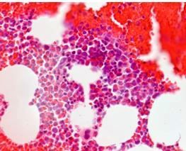 Paracentesis revealed ascitic fluid with negative Gram stain/culture, but with a serum ascites albumin gradient of 3.0 and absolute eosinophil count of 6200/µL. Bone marrow biopsy of the left iliac crest showed moderately hypercellular myeloid-predominant bone marrow with marked eosinophilia (Figure 2, left). Flow cytometry and chromosome analysis studies, specifically CD3, CD4, CD8, and CD34 expressions, were negative. Tests for stool ova and parasites and for serum Strongyloides antibodies were negative. Results of autoimmune serologic studies, including ANA, ANCA, and lupus anticoagulant, were negative. Results of quantitative immunoglobulin tests were unremarkable.