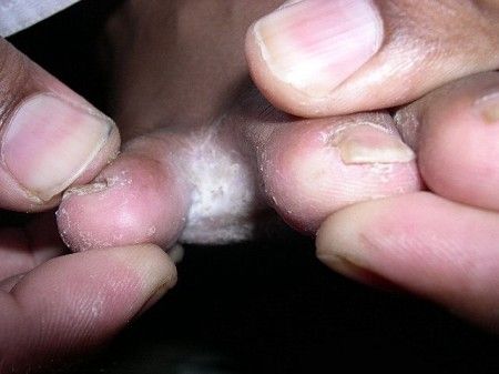 A 45-year-old man complained about moderate itching and scaling between his toes on both feet.