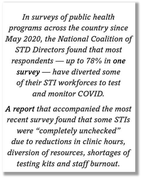In surveys of public health programs across the country since May 2020, the National Coalition of STD Directors found that most respondents — up to 78% in one survey — have diverted some of their STI workforces to test and monitor COVID. A report that accompanied the most recent survey found that some STIs were “completely unchecked” due to reductions in clinic hours, diversion of resources, shortages of testing kits and staff burnout.