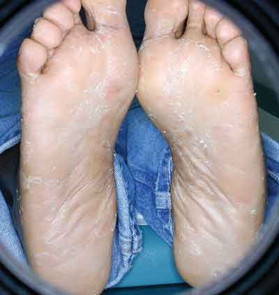 Tinea pedis, or athlete's foot, is common in elderly persons. It manifests as maceration in the interdigital web folds and as scaly plaques on the plantar surfaces of the feet (Figure). A potassium hydroxide evaluation can establish the diagnosis. Tinea pedis is commonly associated with xerosis. It is best treated with a topical antifungal agent; treatment can be aided by a keratolytic such as lactic acid 12% cream.