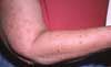 A 25-year-old woman who has had a low-grade fever and nonproductive cough for several days presents with a rash that appeared on her palms, arms, and legs 3 days ago. The rash is slightly pruritic and tender. The patient has been taking acetaminophen and an over-the-counter cough medicine; she also uses an oral contraceptive.