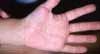 Case 1: The patient has atopic dermatitis, A. The hyperlinearity of the palms confirms the presence of atopy. The stress of starting first grade was sufficient to exacerbate his condition. The rash was controlled with a mild topical corticosteroid.