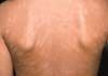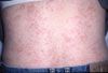 For 2 to 3 weeks, a 32-year-old woman has been troubled by a highly pruritic eruption, primarily on the trunk. She recently started exercising at a local club several times a week and has purchased some new workout clothing. She also has started to shower more frequently. She has a family history of allergies but none herself. She has not been ill recently and takes no medication other than an oral contraceptive. She has no pets.