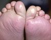 For several weeks, a 10-year-old boy's feet have been scaly and pruritic. He plays basketball and soccer and recently bought new shoes. A trial of over-the-counter miconazole was ineffective. The patient has a history of childhood eczema but outgrew it about 5 years ago.