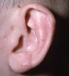 For several weeks, an 18-year-old man has been bothered by itchy ears. He has seasonal allergies that are well controlled with oral antihistamines. He has not been exposed to contactants and has not used any nutritional supplements or new shampoos or conditioners. He works out at a gym 5 days a week.