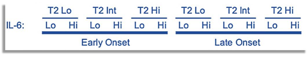 Groups were identified as early- vs Iate-onset, T2 Lo, T2 Intermediate or T2 Hi (0, 1 or 2 T2 biomarker elevations), and each of these groups further defined by IL-6 Hi vs IL-6 Lo.