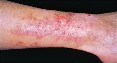 Figure 2 – This intensely pruritic rash on a man's leg is dermatitis herpetiformis, a cutaneous manifestation of celiac disease.