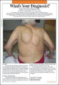 I applaud Dr Henry Schneiderman for his remarks in a recent “What’s Your Diagnosis?” column regarding the proper way to perform auscultation and percussion of the chest (CONSULTANT, October 2008, page 874). I am a family practitioner, and I examine my patients on their bare skin. It is a shame that I have had to remind my own primary care physician, my cardiologist, and my pulmonologist to listen to my heart and lungs through my skin-as we were all taught to do in medical school-rather than through my clothes. It is a breath of fresh air to have someone address this issue.