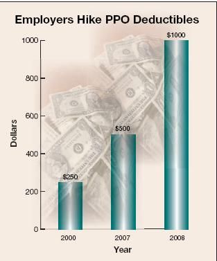 The median deductible for employees with individual coverage in PPO employer health plans jumped to $1000 in 2008, up from $500 in 2007 and $250 in 2000, according to the National Survey of Employer-Sponsored Health Plans, an annual report released on November 19 by Mercer (Figure). This significant increase was found among traditional PPOs, the most common type of plan (covering 69% of insured employees). Nearly four-fifths (79%) of employers imposed a deductible for PPO coverage in 2008 compared with about half (52%) of employers in 2000. For the survey, approximately 2900 private and public employers with 10 or more employees were interviewed in August and September.