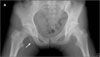 A 13-year-old girl felt a “pop” while doing a split during gymnastics. She later complained of right hip pain and inability to bear weight on the right leg.
