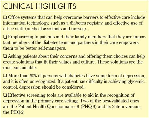 Type 2 diabetes mellitus may be the most challenging and frustrating disease faced by primary care clinicians. Excellent evidence exists that reaching goals for hemoglobin A1c (HbA1c), low-density lipoprotein (LDL) cholesterol, and blood pressure significantly reduces diabetic complications1,2 and costs.3 Fortunately, effective therapeutic options are available for reaching these goals. But unfortunately, even with our best efforts, only 48% of patients with diabetes reach goal for HbA1c and only 33% for LDL and blood pressure; only 7% achieve all 3 goals concurrently.4