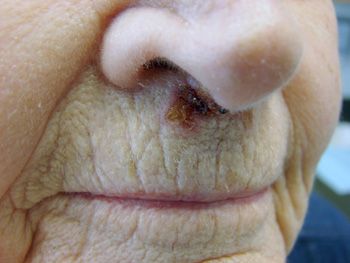 An 82-year-old woman presents with a persistent “face sore,” which she ascribed to repeatedly and frequently blowing her nose during a recent upper respiratory tract infection. However, the respiratory infection had resolved some 2 months before presentation. The patient felt that all she needed was a prescription for a topical or oral antibiotic.