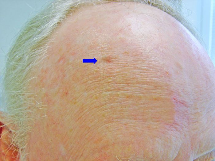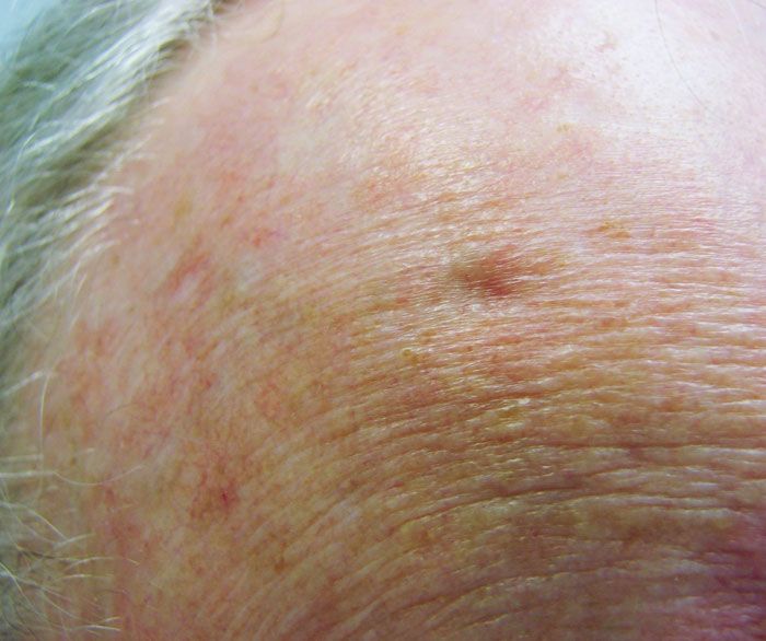 A 78-year-old man sought medical attention after noting a non-tender, subtle “hole” in his forehead. The firm lesion was asymptomatic.