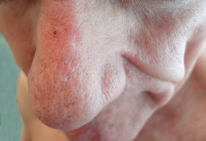 Key point: Physical examination disclosed very small papules with a single spot of dried blood at one side. Almost no benign disorder affecting nasal skin should bleed. A small shave biopsy revealed basal cell carcinoma.