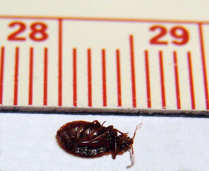 Key point: Occasionally patients will bring in specimens for examination to determine whether the organisms are responsible for “bites” or other skin conditions (such as hives). In this instance, the rounded shape, flattened body, and size (about 5 mm) of this brown, 6-legged insect are all classic features for a bedbug. These insects are nocturnal blood feeders, which is why the patient noticed new lesions in the morning.