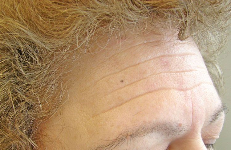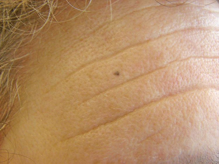 An 50-year-old woman was concerned about the recent appearance of a small dark spot on the forehead. She denied trauma to the affected area, and was not taking medication.