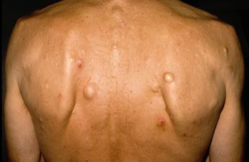 Note: The unusual feature here is the large number of epidermal cysts. This should arouse suspicion of Gardner syndrome, an autosomal dominant trait characterized by premalignant intestinal polyposis, epidermoid cysts, osteomas, and desmoid or fibrous tumors of the skin and other sites. Epidermal cysts occur in 35% of individuals with Gardner syndrome.