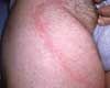 A 58-year-old man has had a slightly pruritic scaly eruption in the groin for 2 to 3 weeks. The rash appeared after he sustained a biking injury and underwent epidural corticosteroidinjection for low back pain. He had been an avid biker before the injury and is otherwise healthy.
