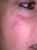 A 42-year-old woman has been bothered by slightly pruritic papules on her cheeks for the past 2 to 3 weeks. She has used a new sunscreen this year and has visited a tanning salon several times. Her only regular medications are an oral contraceptive and ibuprofen for menstrual cramps.