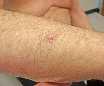A 61-year-old obese, man with type 2 diabetes presented with the gradual onset of a mildly tender lesion on the dorsum of the right arm. He had a well-known history of actinic keratoses and multiple nonmelanoma skin cancers.