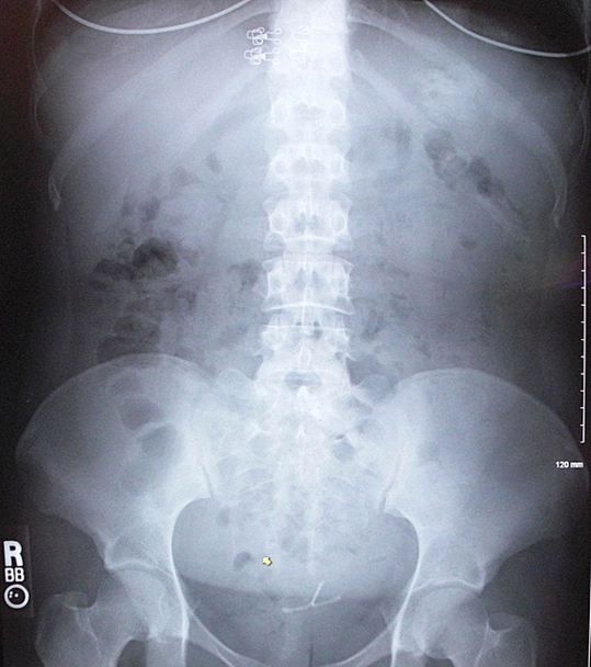 Blood is sent to the lab to ascertain a possible cause for the nausea such as hyponatremia, renal failure, ketoacidosis, infection, or pregnancy. A CBC, Chem-12, UAma and pregnancy test all are normal. Although it is typically low yield in a case like this, a KUB (kidneys, ureter, bladder) x-ray is ordered since no other cause has been found and the patient’s symptoms have shown no improvement after 6 days of conservative management, including multiple antiemetics.