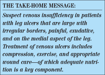 Lower extremity ulcerations have characteristic presentations depending on the cause. Venous insufficiency ulcers tend to be large with irregular borders, painful, exudative, and generally on the medial aspect of the leg. Precursor skin changes that indicate venous insufficiency include edema, bluish discoloration of the skin, and varicosities. Although this man’s ulcers were characteristic of those caused by venous dysfunction, he did not have the skin changes usually noted. However, he had previous vein stripping in his right leg, which suggested that he had a history of venous insufficiency.