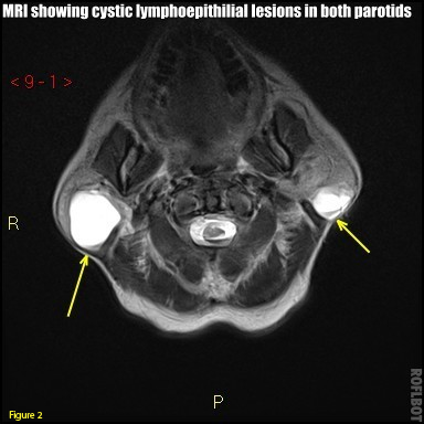 CT scan and MRI of the head and neck showed normal midline structures. Multiple masses were seen bilaterally in the parotid glands; the largest mass on the right side measured 3 cm; the largest on the left measured 1.2 cm (Figures 1 and 2).