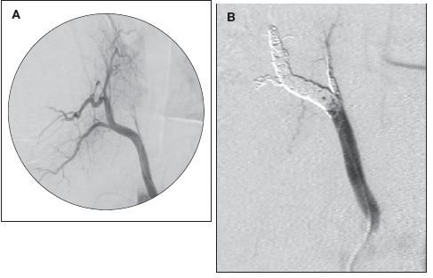Figure 3 – An aortic angiogram shows the feeding artery to the sequestration (A) and subsequent embolization of the feeding artery (B).