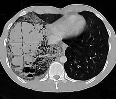 Figure 2 – This CT scan shows a right hemothorax, a lower lobe mass extending to the middle lobe, cystic areas surrounding the mass, and what appears to be a vessel coming off the descending aorta adjacent to the celiac axis and feeding into the mass.