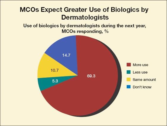 The 2007 edition of the Galderma Quality Report for Dermatology & Managed Care found that 67% of dermatologists surveyed prescribed more biologic therapies for psoriasis during the past year than previously. Nearly 70% of MCOs surveyed anticipate that dermatologists will use more biologic treatments in the future (Figure 1).