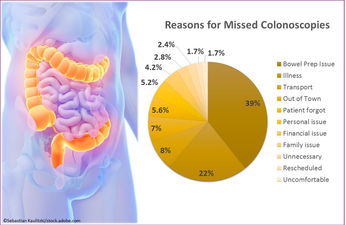 Reasons for missed colonoscopies (Adapted from Castillo M. Poster presented at: ACG 2019 Annual Scientific Meeting; October 2019; San Antonio, TX)