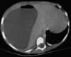 An ultrasonogram of the abdomen discloses a large hypodensity in the right lobe of the liver. The abdominal CT scan is shown here.