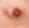 A 29-year-old sailor presented with a painless, enlarging, reddish, mobile lump under his left nipple. Four months earlier, while on deployment in the South Pacific, he had his nipples pierced on a whim. At the piercing studio, he purchased 2 barbell-type nipple rings that were individually packaged and autoclaved. Povidone-iodine was applied to his skin, and the nipples were pierced with a large-bore needle. He was instructed to wash the area daily and leave the jewelry in for at least 3 months.