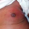 THE CASE: A 15-day-old boy is brought for evaluation after his mother noted a "lump" in his left breast that morning. There is no history of illness or trauma. The infant's appetite and activities are normal, and he has no constitutional symptoms. He was delivered vaginally at full term and did not require a prolonged nursery stay or antibiotic therapy. Results of standard maternal screens were negative.