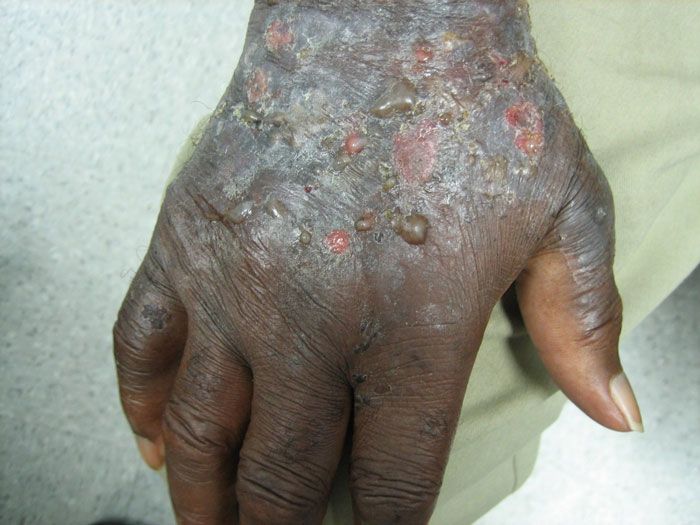 A 69-year-old man noted the gradual onset of multiple small blisters on the hands. These lesions did not itch, but did hurt when the blisters eventually ruptured. The patient also had scattered similar lesions on both thighs and a few on the upper, anterior chest.