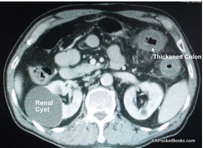 This type of presentation of C difficile colitis is not uncommon. His CT scan showed thickened colonic walls, but no perforation. He had multiple risk factors for C difficile, including recent hospital admission, recent broad-spectrum antibiotics, and use of a proton pump inhibitor (PPI).