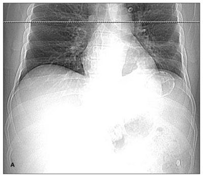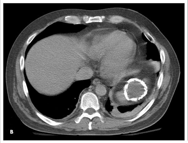 A 38-year-old man found lying on the floor in his home was hospitalized because of alcohol intoxication. A chest radiograph showed a large calcified lesion in the left upper abdomen (A). A CT scan with intravenous contrast revealed a large, well-defined, cystic mass with mural calcification in the spleen (B). The CT findings were not consistent with a vascular malformation or echinococcal cyst-specifically, the mass was sharply demarcated, unilocular without septations, and round with a thin wall and attenuation similar to water. Urine Histoplasma antigen test results were negative.