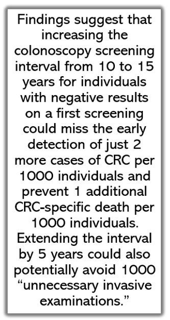 According to the study authors, their findings suggest that increasing the colonoscopy screening interval from 10 to 15 years for individuals with negative results on a first colonoscopy could miss the early detection of just 2 more cases of CRC per 1000 individuals and prevent 1 additional CRC-specific death per 1000 individuals. Extending the interval by 5 years could also potentially avoid 1000 “unnecessary invasive examinations,” researchers wrote.