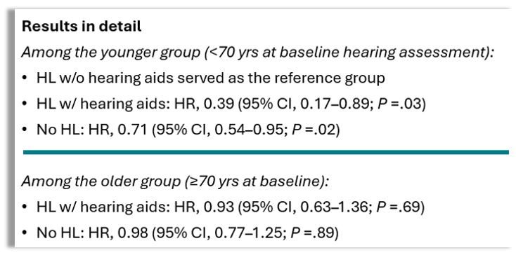 Compared with the HL group without hearing aids, individuals younger than 70 years with HL who used hearing aids had a significantly lower risk of dementia (HR, 0.39; 95% CI, 0.17–0.89; P =.03). Participants without HL also showed a reduced risk (HR, 0.71; 95% CI, 0.54–0.95; P =.02). Francis et al found no association between use of hearing aids and incident dementia among participants aged 70 years and older. The relationship between hearing aid use and dementia was not diminished in participants aged 60 to 69 after adjusting for 10-year vascular risk and education level.