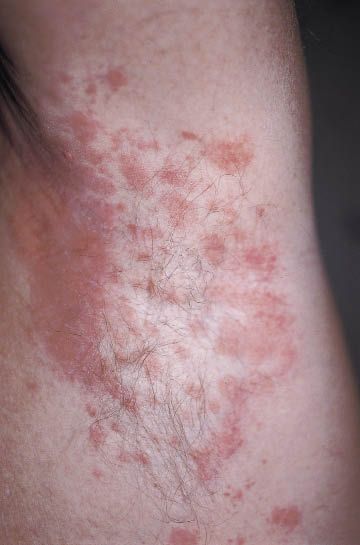 For 3 weeks, a 28-year-old man has had a pruritic, bilateral axillary rash. He stopped using deodorant, but the condition has not improved.