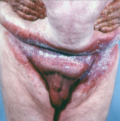 The axillae, perineum, inframammary creases, and abdominal folds are the most common sites of involvement. The apposed skin surfaces rub against each other, causing erosions that become inflamed. Sweat, feces, urine, and vaginal discharge may aggravate intertrigo in both adults and infants.