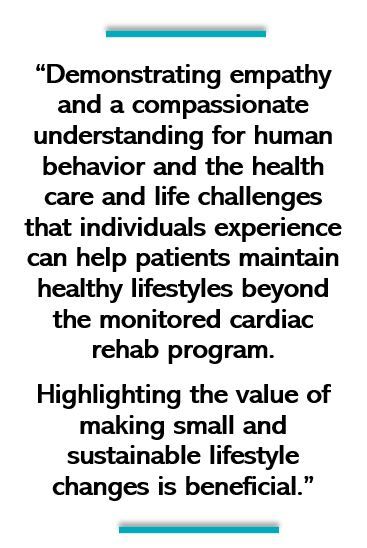 Demonstrating empathy and a compassionate understanding for human behavior and the healthcare and life challenges that individuals experience can help patients maintain healthy lifestyles beyond the monitored cardiac rehab program. Highlighting the value of making small and sustainable lifestyle changes is beneficial.