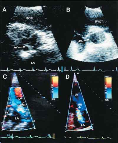 Two-dimensional transthoracic echocardiographic studies show incidental heart-shaped findings. In Photo A, a short axis view of the heart of a 54-year-old woman, the opening of the tricuspid aortic valve simulates the “Valentine’s sign,” or heart shape. Photo B shows a normal tricuspid aortic valve in another woman for comparison. Photo C, an apical 4-chamber view with color-flow Doppler application in a 57-year-old woman, shows mosaic mitral regurgitation in the shape of an upside-down heart. Photo D shows non–heart-shaped mosaic mitral regurgitation in another woman for comparison.