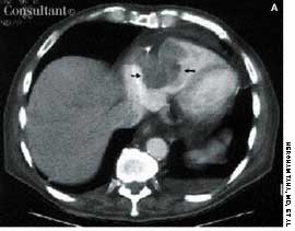 A 74-year-old man was evaluated for iron deficiency anemia. Two-dimensional echocardiography revealed a large mass in the right side of the heart and a pericardial effusion. A pericardial window was created, and it drained 400 mL of serous fluid. CT of the chest disclosed a 5-cm mass within the right side of the heart, centered in the region of the tricuspid valve and extending into the right atrium and ventricle. The diagnosis was primary cardiac B-cell lymphoma unrelated to the previously diagnosed anemia.