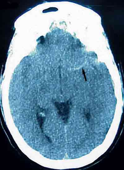 A 36-year-old man who had collapsed and sustained a bruised right shoulder was brought to the emergency department with acute emesis, cephalgia, blurred vision, aphasia, and right hemiparesis. The initial CT scan of the brain revealed a linear hyperdensity in the region of the left middle cerebral artery, indicating thrombus formation. An area of cerebral edema was noted with a small effacement from left to right. The patient had an internal carotid artery dissection.