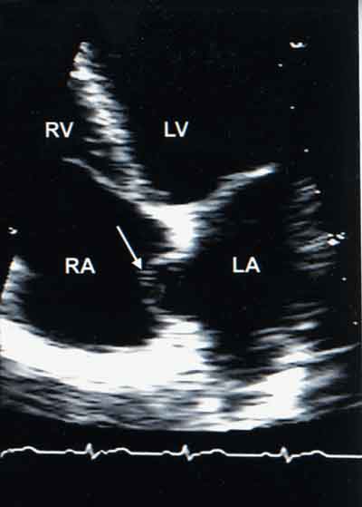 Interatrial septal aneurysms (IASA) and patent foramen ovale (PFO) (see previous image) frequently cause cryptogenic cerebral and peripheral thromboemboli. Recognition and documentation of these abnormalities during an echocardiographic study is essential. This view shows a typical IASA bulging into the right atrium in an asymptomatic 58-year-old man; there is no detectable PFO.