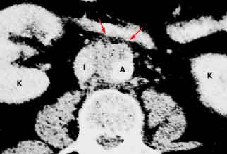 An obese 61-year-old man who had chronic obstructive pulmonary disease and sleep apnea heard a “pop” in his stomach while lifting a heavy weight; severe abdominal pain followed. In a CT scan of the abdomen and pelvis, arrows point to inflammation in the aortic wall (A) and the paraaortic retroperitoneal fat (I, inferior vena cava; K, kidney.) Calcified atherosclerotic plaques were visible, but the aorta was not dilated. There was neither retroperitoneal hematoma nor contrast extravasation to suggest rupture. The patient had aortitis.