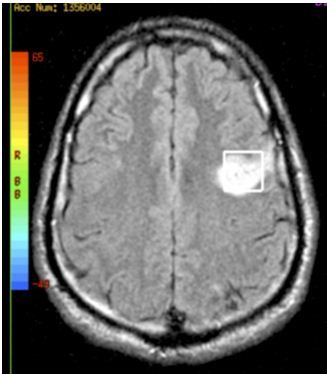 A 42-year-old man presented after multiple episodes of difficulty in speaking. MRI of the brain without contrast suggested an acute infarct in the left frontal supraventricular white matter. Subsequent MRI with contrast indicated a subacute infarct. MRI spectroscopy verified an ischemic infarct. The patient underwent transesophageal echocardiography, seen here, that showed a patent foramen ovale (PFO). The diagnosis was cryptogenic ischemic stroke. Approximately 40% of cryptogenic ischemic strokes are attributed to PFO.