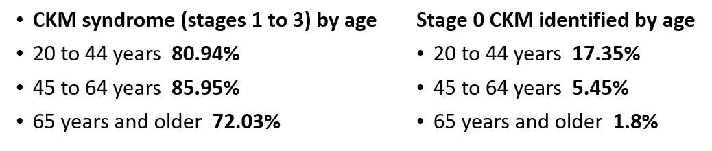 More than three-quarters of US adults have stage 1 to 3 cardiovascular-kidney-metabolic (CKM) syndrome, including individuals without evidence of clinical cardiovascular disease (CVD), according to findings published as a research letter in the Journal of the American College of Cardiology. Among adults aged 65 years and older only 1.8% met criteria for CKM stage 0.1